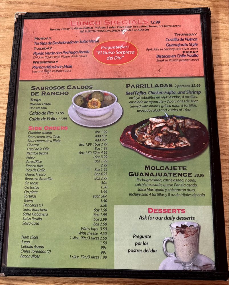 Highlighting the rich culinary heritage from Guanajuato, you can dive into delicious antojitos guanajuatenses like pambazos, huaraches, and sopes. Don’t miss the enticing pierna y muslo en mole served on Wednesdays, or indulge in enticing kids' plates featuring chicken nuggets and cheese enchiladas.
